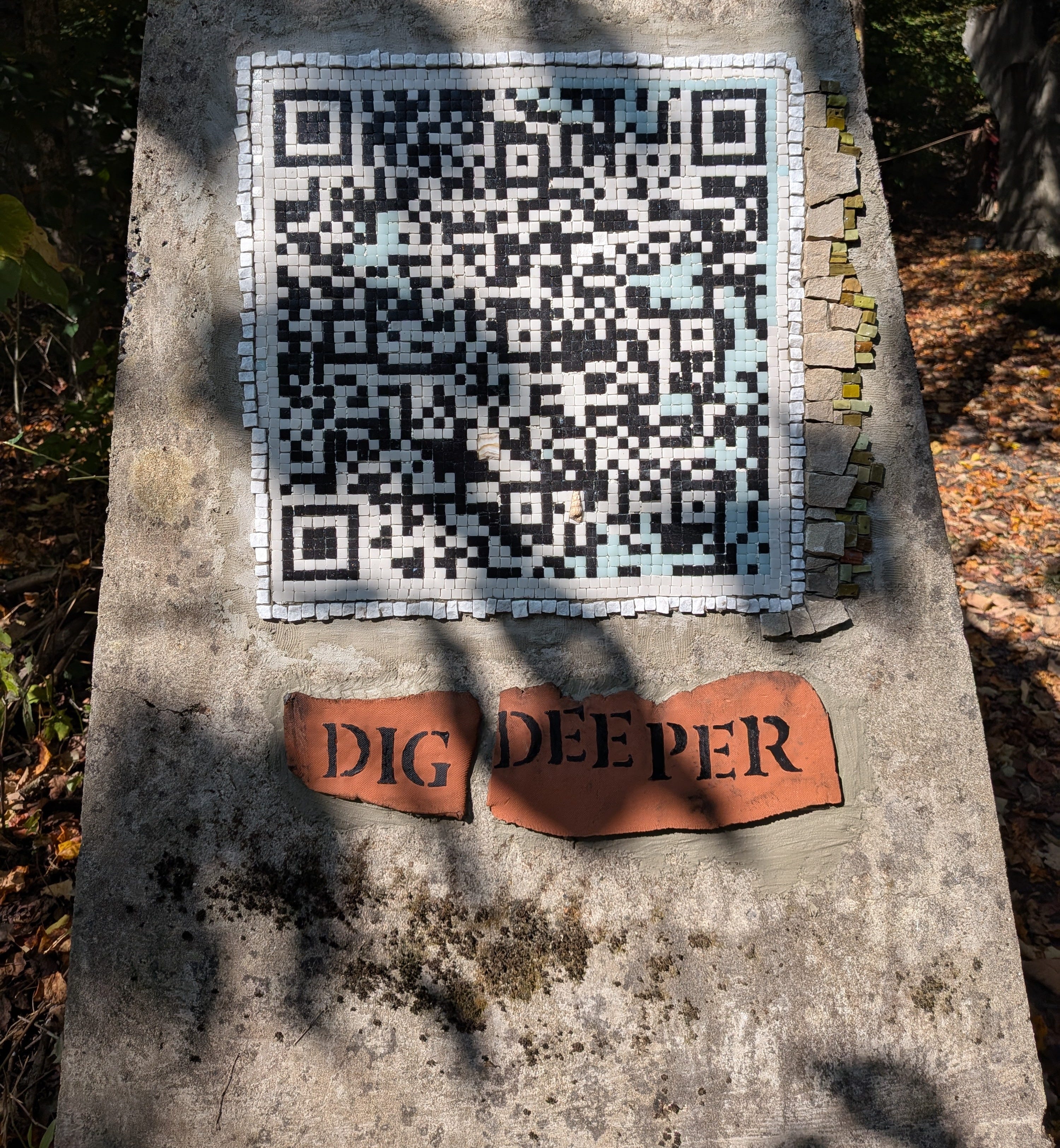 My latest experiment has been to build a succession of mosaic QR codes that take the viewer to very mosaic destinations. A tender trap set for the twenty somethings who prefer to talk through the screen. I love watching them raise their phones up to scan, even before quite realizing that this particular code is actually real life, something to be touched and appreciated from different angles.