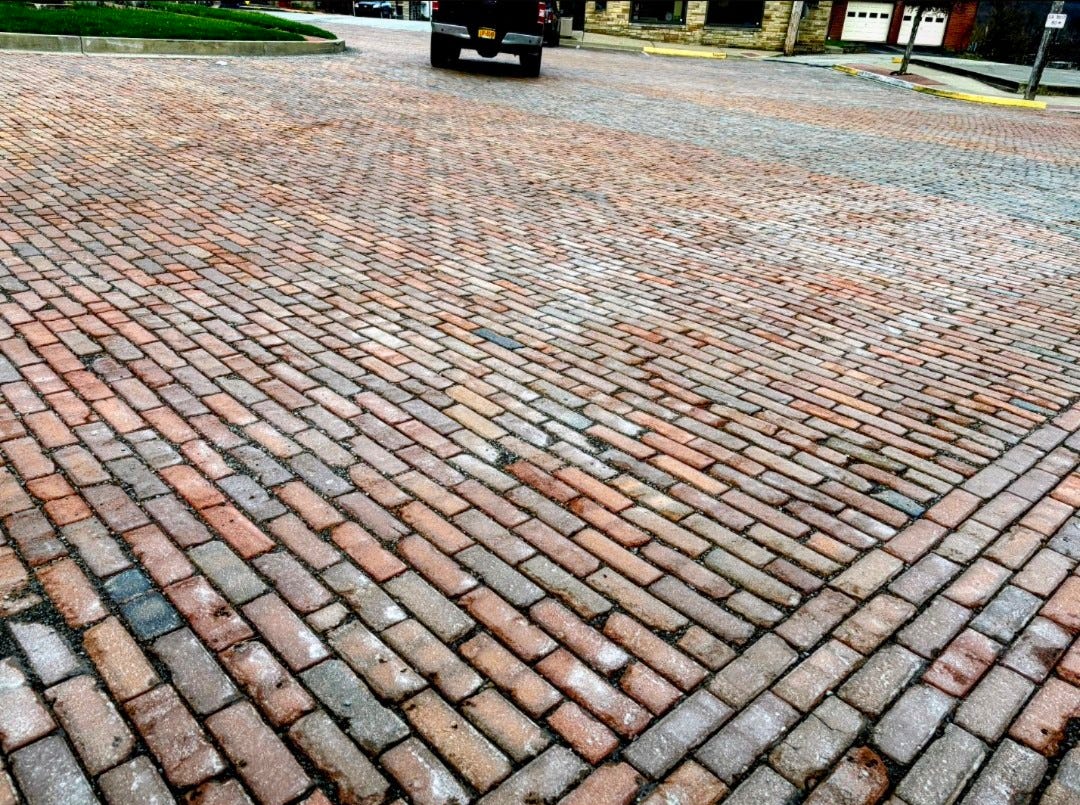 And now, an update on last week’s town council meeting about the Perryopolis bricks. Yes, the defining characteristic of our little town center, the bricks my great-grandfather helped lay, the bricks my grandmother stood on as she said to the bulldozer, “You’ll have to go through me.” The very brick story I chose to place as the closing chapter of my saving old places book, those historic bricks will indeed be torn out and replaced with a facsimile of stamped concrete meant to look like them.