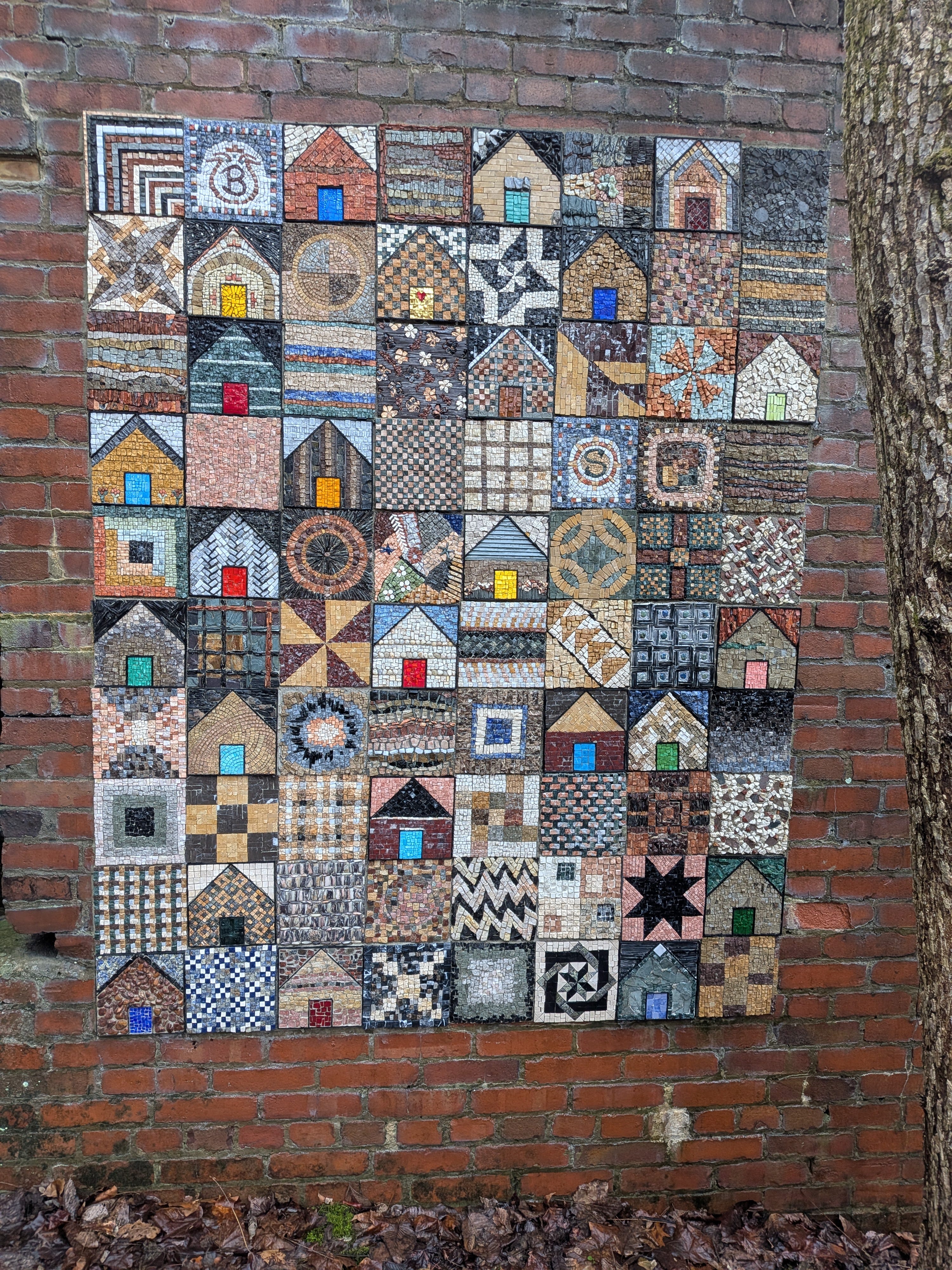 Our first pairing of fabric and tesserae was an accident. This next one will be on purpose. Just imagine how much fun Roz and Jim will be having, tracking down patterns to match the stone. The bright doors, the geometric lines. A quiltmakers ultimate challenge.